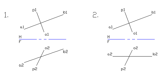 | If two lines are perpendicular, the true angle between them is 90 degrees. In orthographic views, two lines are perpendicular if, in a view where either of the lines appears TL, the angle between the lines is 90 degrees. In case #1, the lines are not perpendicular, even though a 90 degree angles appears in the top view. In case #2, the lines are perpendicular. |