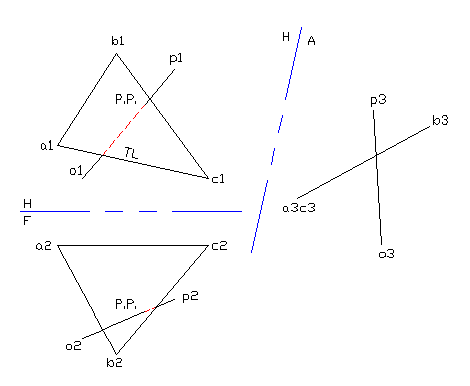 Given: Top and front views of a line and plane. Required: Find the point of intersection (piercing point).