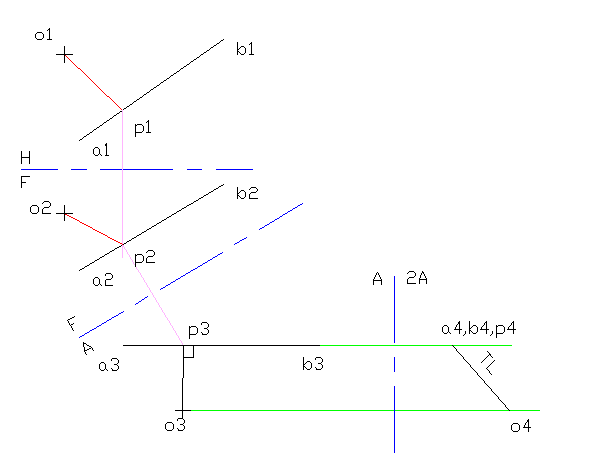 point O to line AB. Show that line in the given views.
