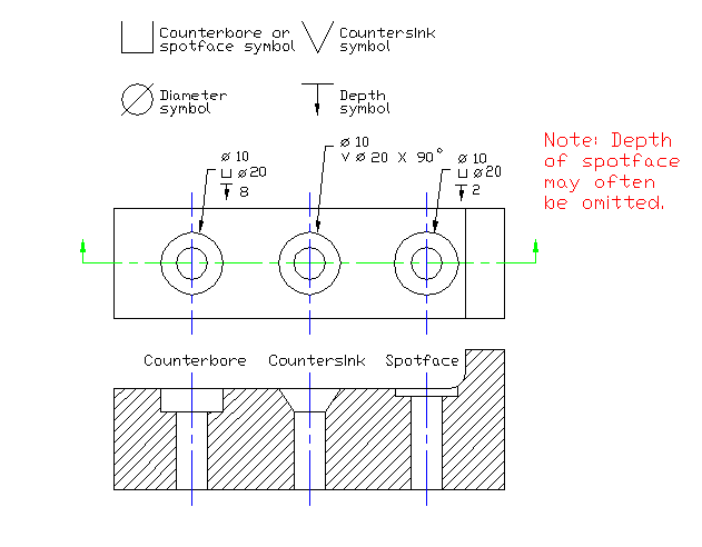 Below are some examples of notes using the current standards for counterbored, countersunk and spotfaced holes.