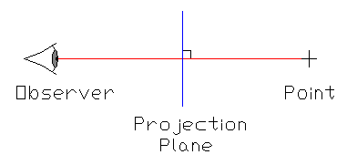 In [FIGURE 3-3], the orthographic projection of a single point is shown. The position of the observer is schematically shown to be at a measurable distance from the projection plane. To orthographically project the image of any geometric feature larger than a point, the observer must be considered to be an infinite distance from the projection plane. With that assumption, the lines of sight will be parallel to each other. [FIGURE 3-4] We will expand on our example to show the orthographic projection of a line in space.
