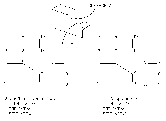 | In Figure 5-1, surface A and edge A are identified in the isometric (3D pictorial) view. Identify the same surface and the same edge in each of the three orthographic views (front, top, and side) provided. |